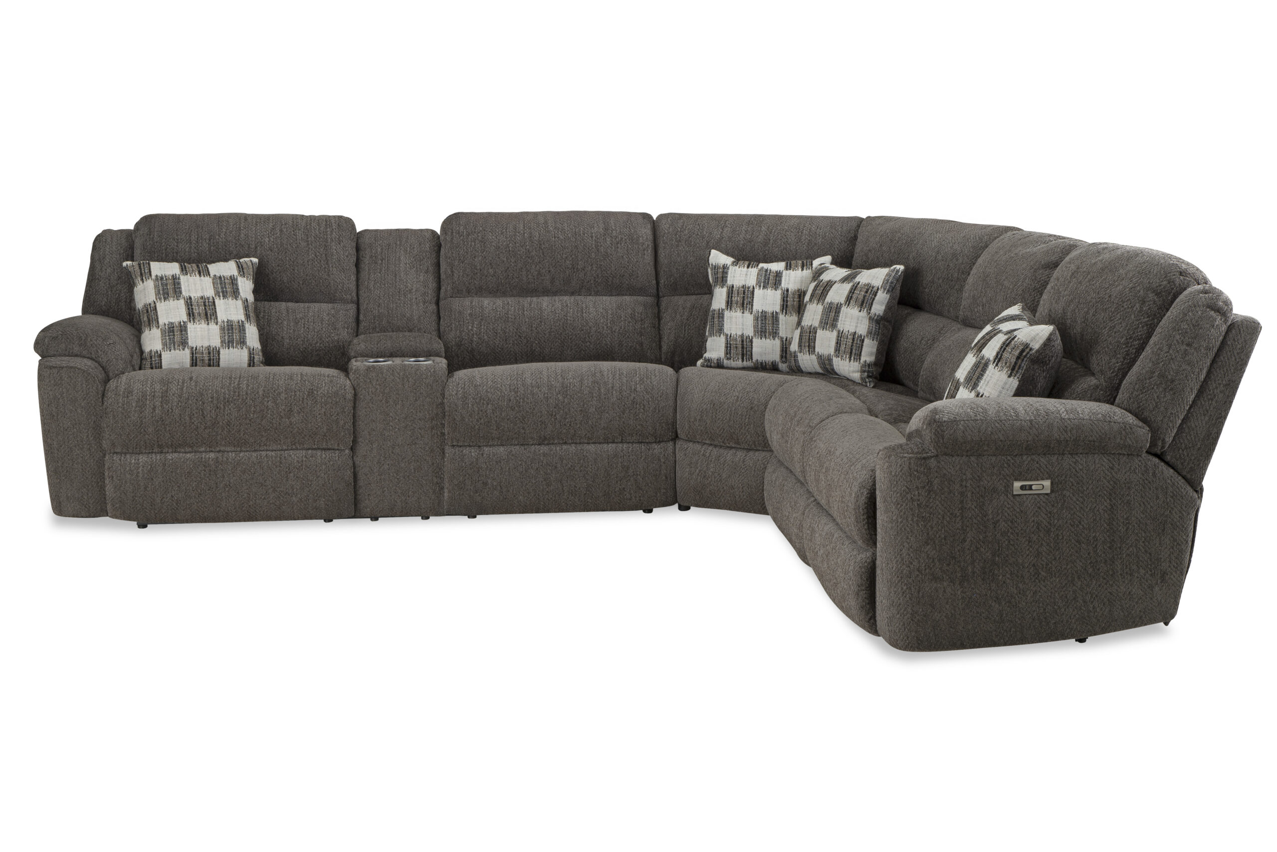 Elevate your living space with this plush, multi-configuration power sectional, designed to be the ultimate centerpiece for relaxation. Featuring a rich, textured charcoal-grey finish and overstuffed cushions, this seating arrangement effortlessly blends cozy appeal with modern, high-tech convenience.Customizable Layout: Tailor the sectional to fit your exact space with customizable length options. Choose between Left-Side Facing (LSF) and Right-Side Facing (RSF) loveseat configurations to create the perfect flow for your room.Built-in Convenience: The integrated console features built-in cup holders, USB charging stations to keep your devices powered up, and a hidden storage compartment perfect for stashing remotes and clutter.Durable & Easy Care: Upholstered in a soft yet highly durable polyester cover, this sectional is designed to withstand everyday use while remaining exceptionally easy to maintain and clean.Effortless Power: Enjoy the premium comfort of smooth power-reclining mechanisms, allowing you to find your perfect lounging angle at the push of a button.Designer Touches: Complementary checkerboard-patterned throw pillows are included, adding a stylish pop of texture that beautifully ties a modern, neutral color palette together.