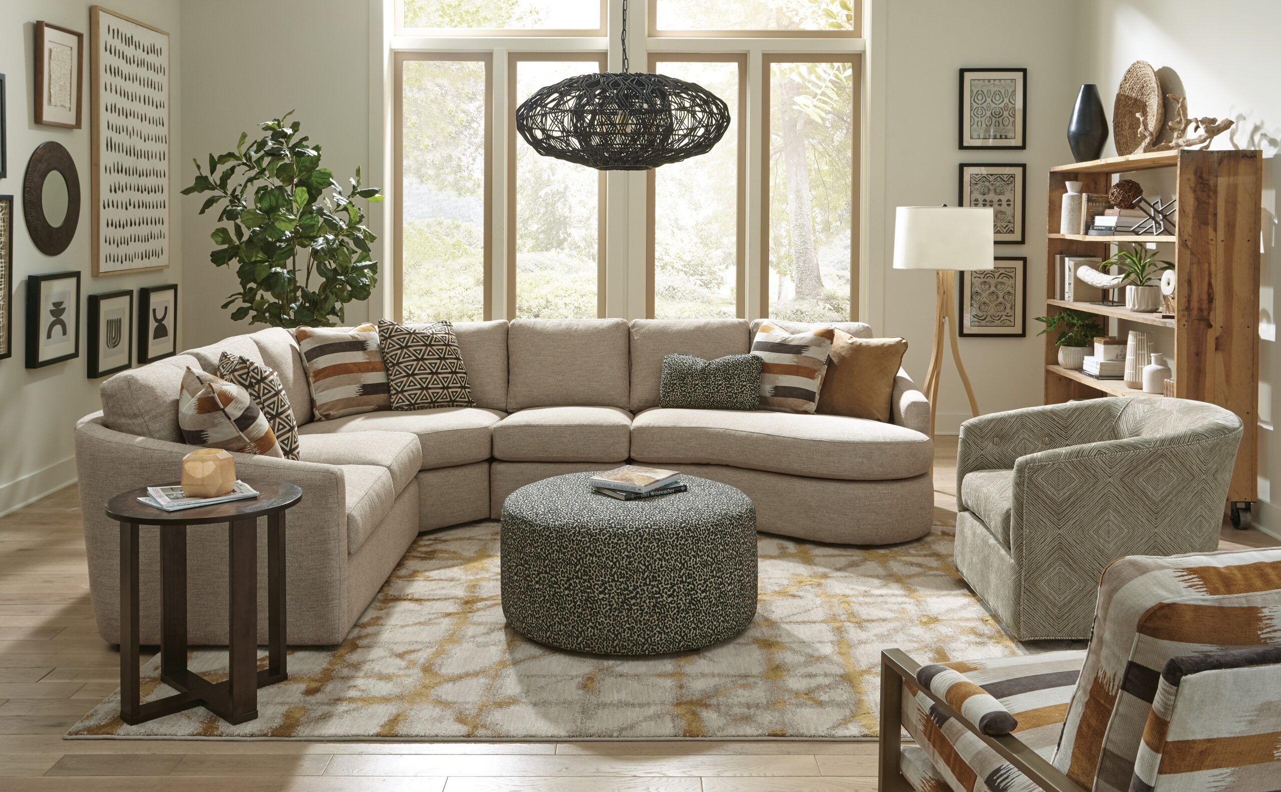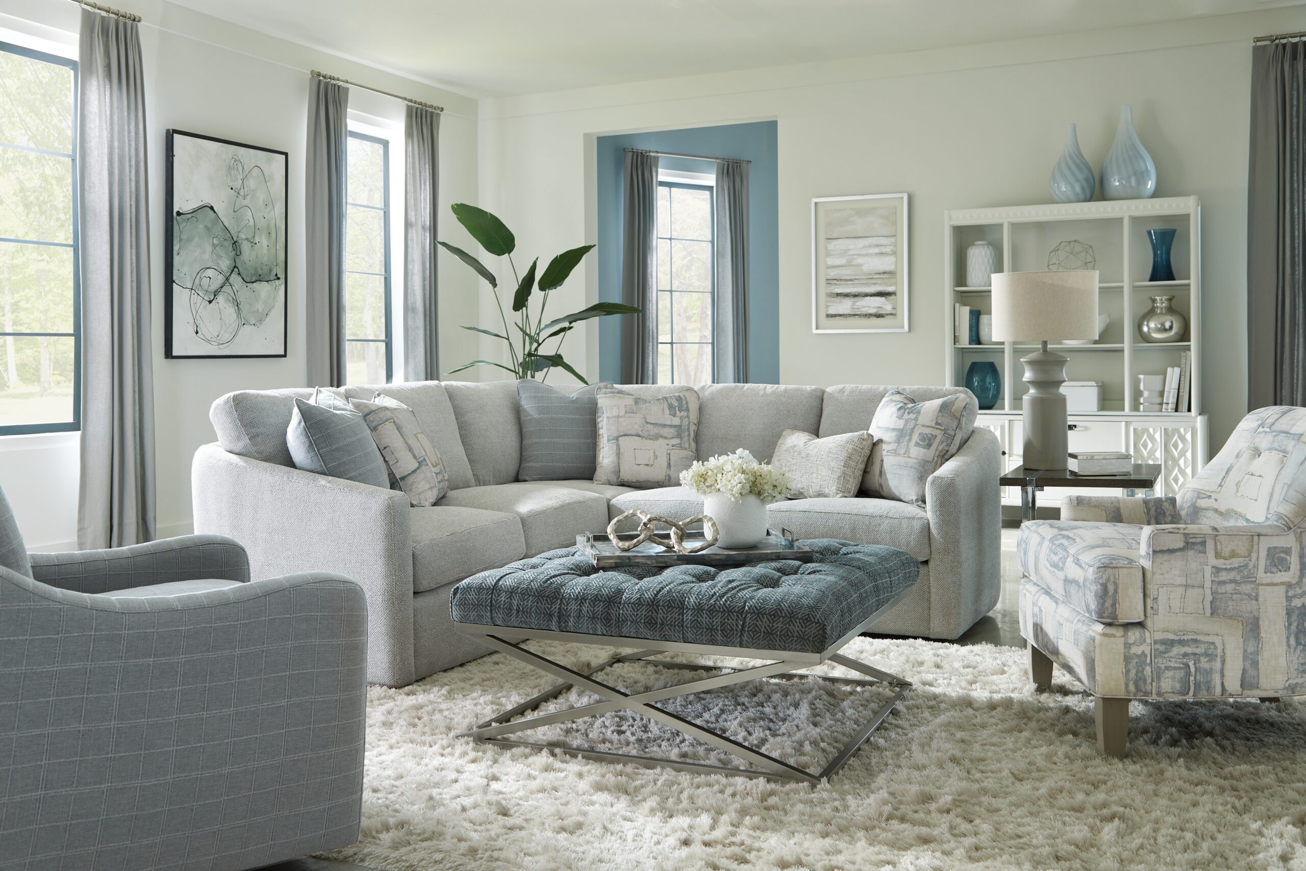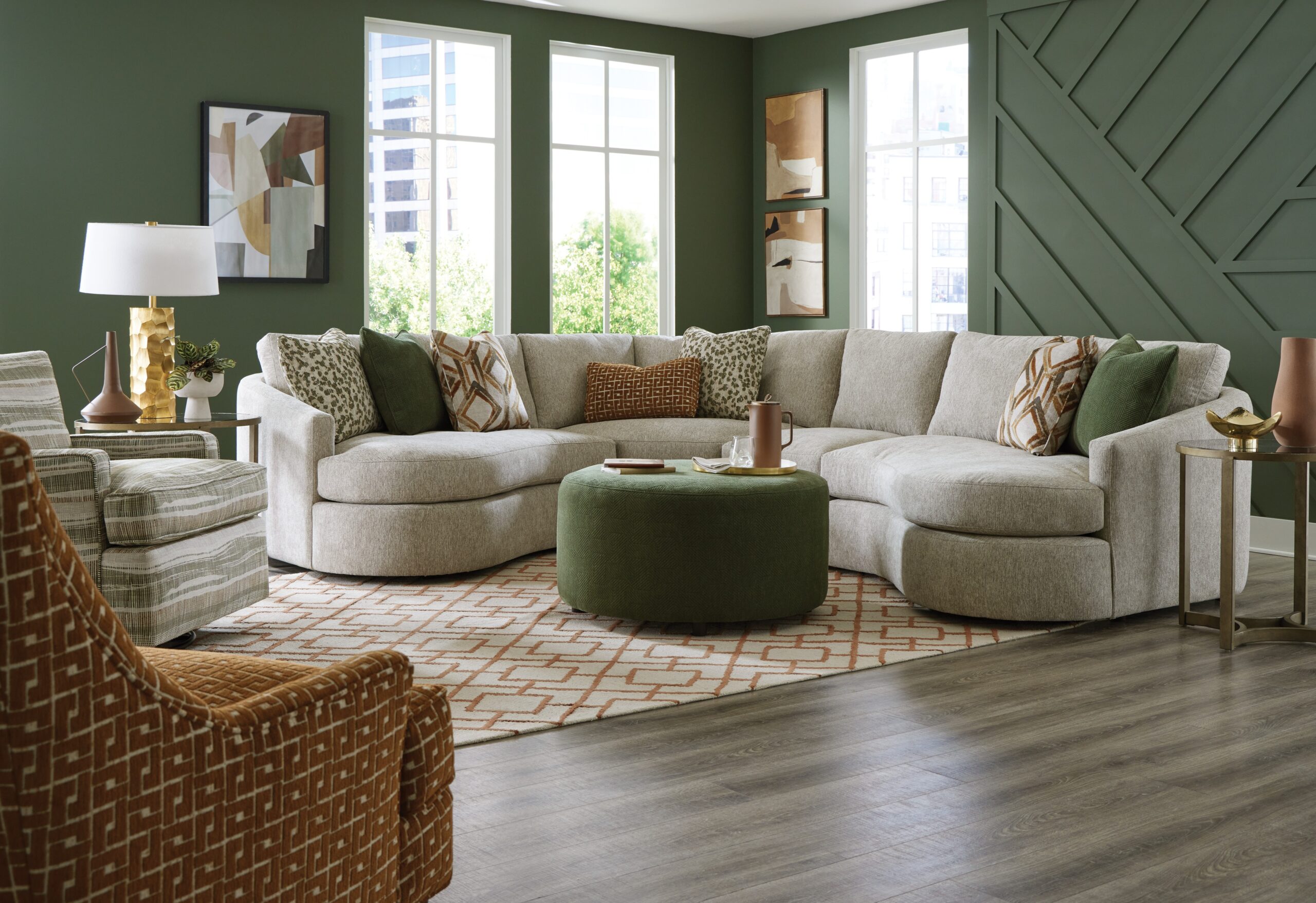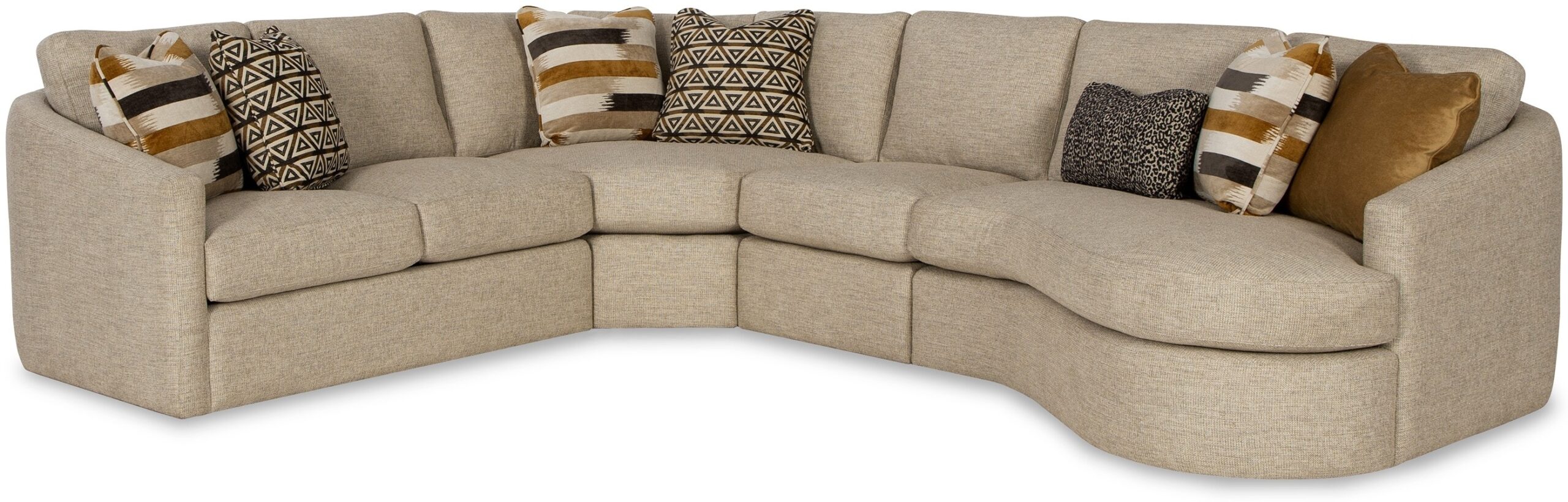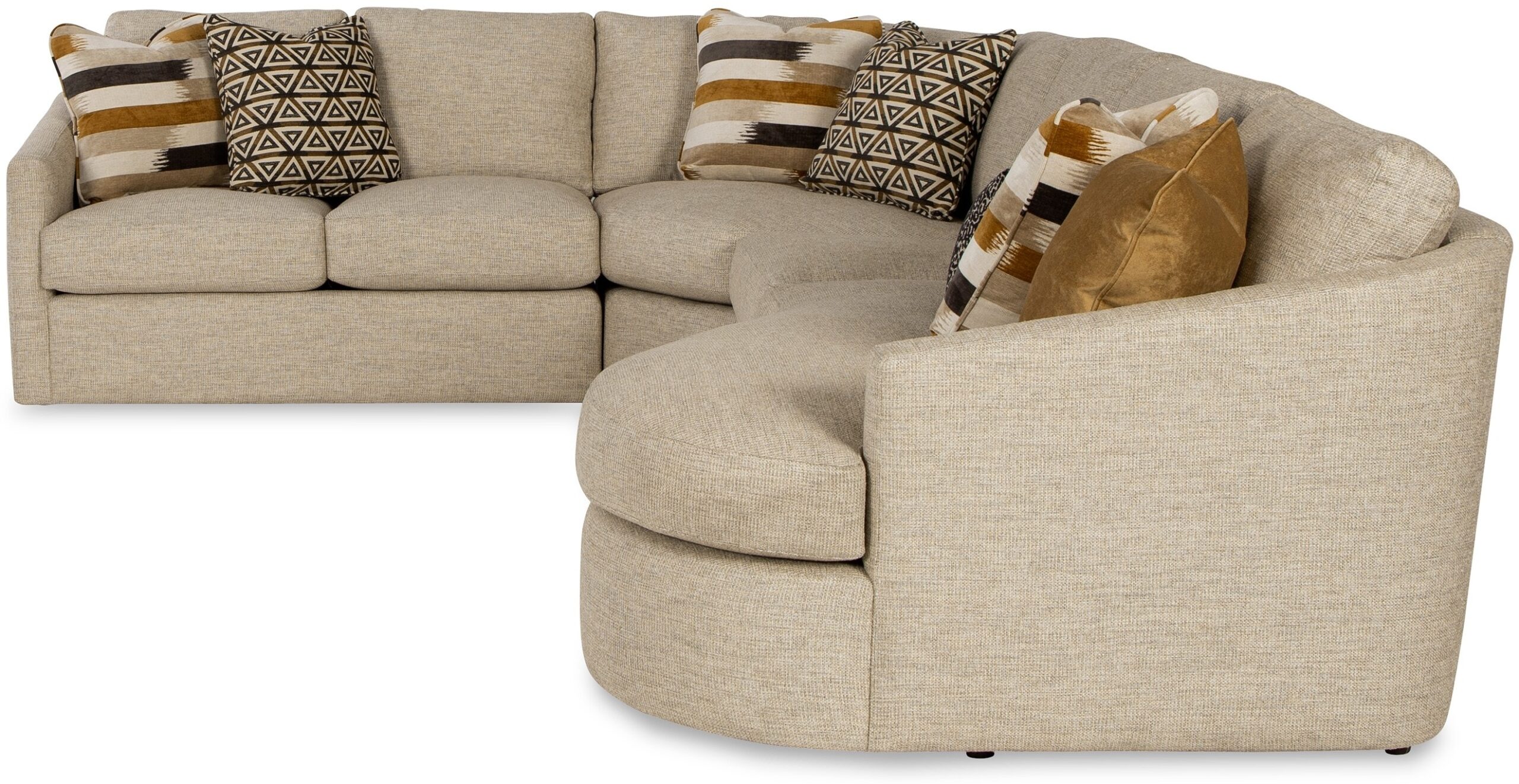 Make a statement with this chic and curvy sectional from our CM Modern collection. It features a high sloping track arm that wraps into a beautiful curve around the back, catching your eye from every angle. French seamed all over to give a clean and modern aesthetic, this piece has loose box border back pillows and plush Blend Down seat cushioning. There are 8 sectional pieces available to create your own unique configuration and fit any space. Also available are the matching sofa, loveseat, chair, and ottoman.
