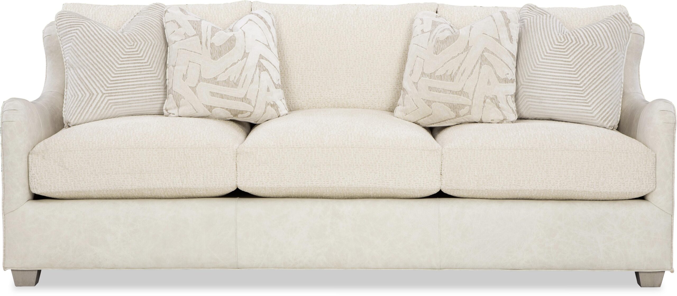 Beautiful organic shaping gives this sofa a casual, welcoming detail that is sure to inspire. Covered in both leather and fabric, it has a unique blended look that can be fully customized with any fabric and leather in our line. (see the Custom Blends order form for details about how to order this). Curvy English arms flow gracefully into the sculpted wing back. Plush Blend-Down Coil seating and loose back pillows wrap you in relaxing comfort. Two pairs of LuxDown toss pillows standard. Also available are the matching loveseat, chair, and ottoman. To order in all leather, see style L7329. To order in all fabric, see style 7329.
