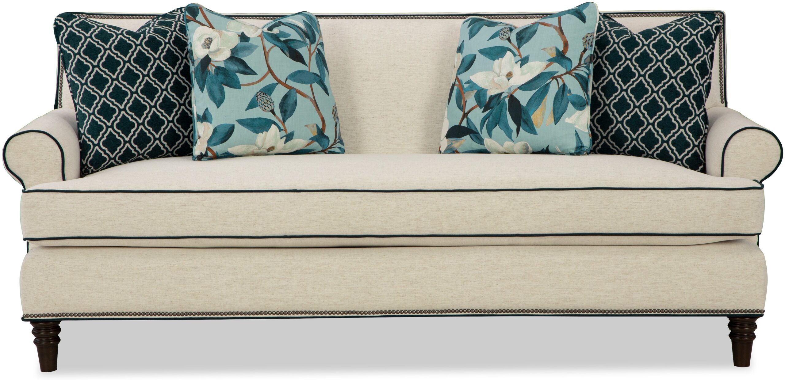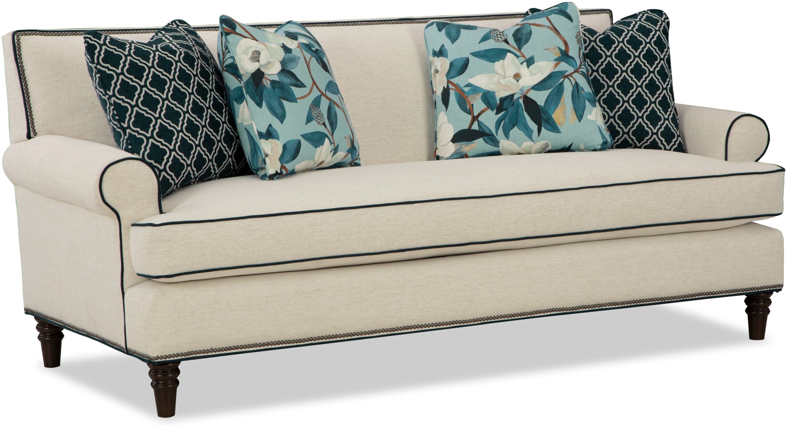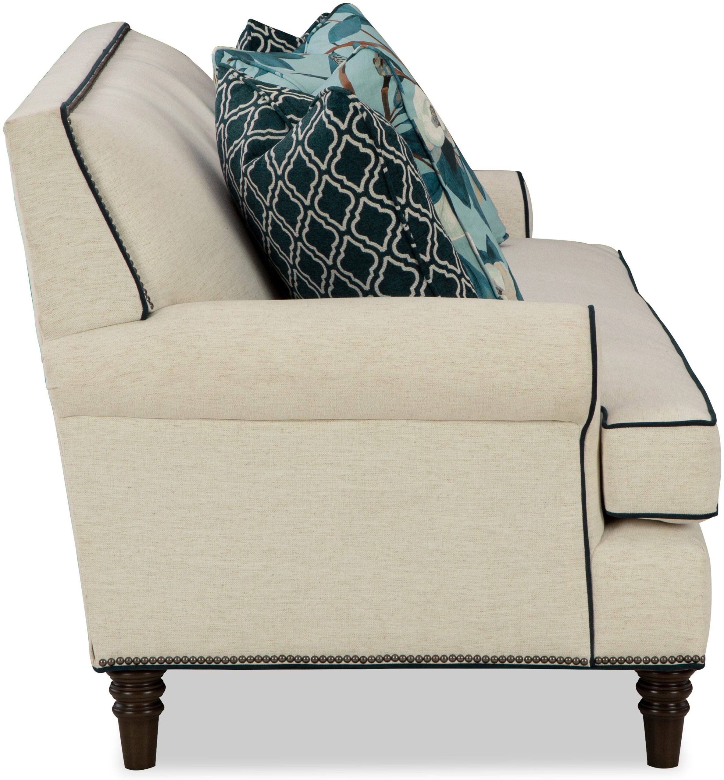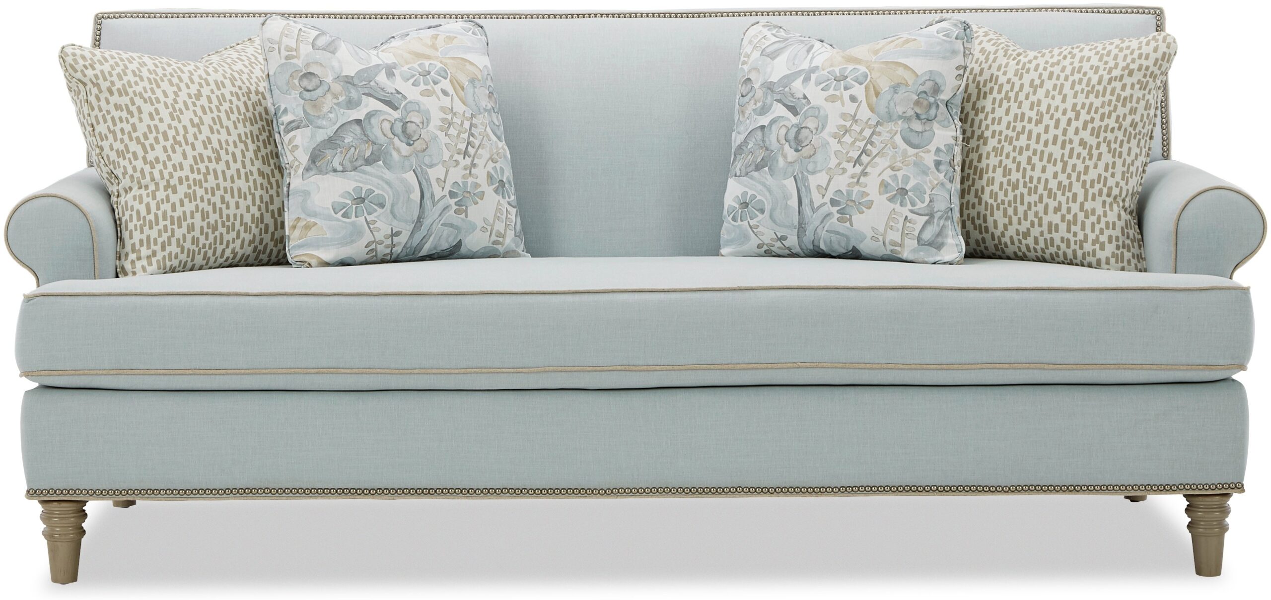 You’ve heard of a showstopper? The show will definitely stop when your guests get their first look at this stunning sofa from the Paula Deen Home collection! The clean, transitional styling of this sofa is accented with gorgeous nail head trim around the back rail and the base. It features sock arms, a tight back, bench seat, and as always, Paula’s exclusive premium Down Blend seat cushion for the ultimate in softness. Standard with 2 pairs of pillows. Also available is the matching loveseat, chair, and ottoman. Also available without nail head trim.