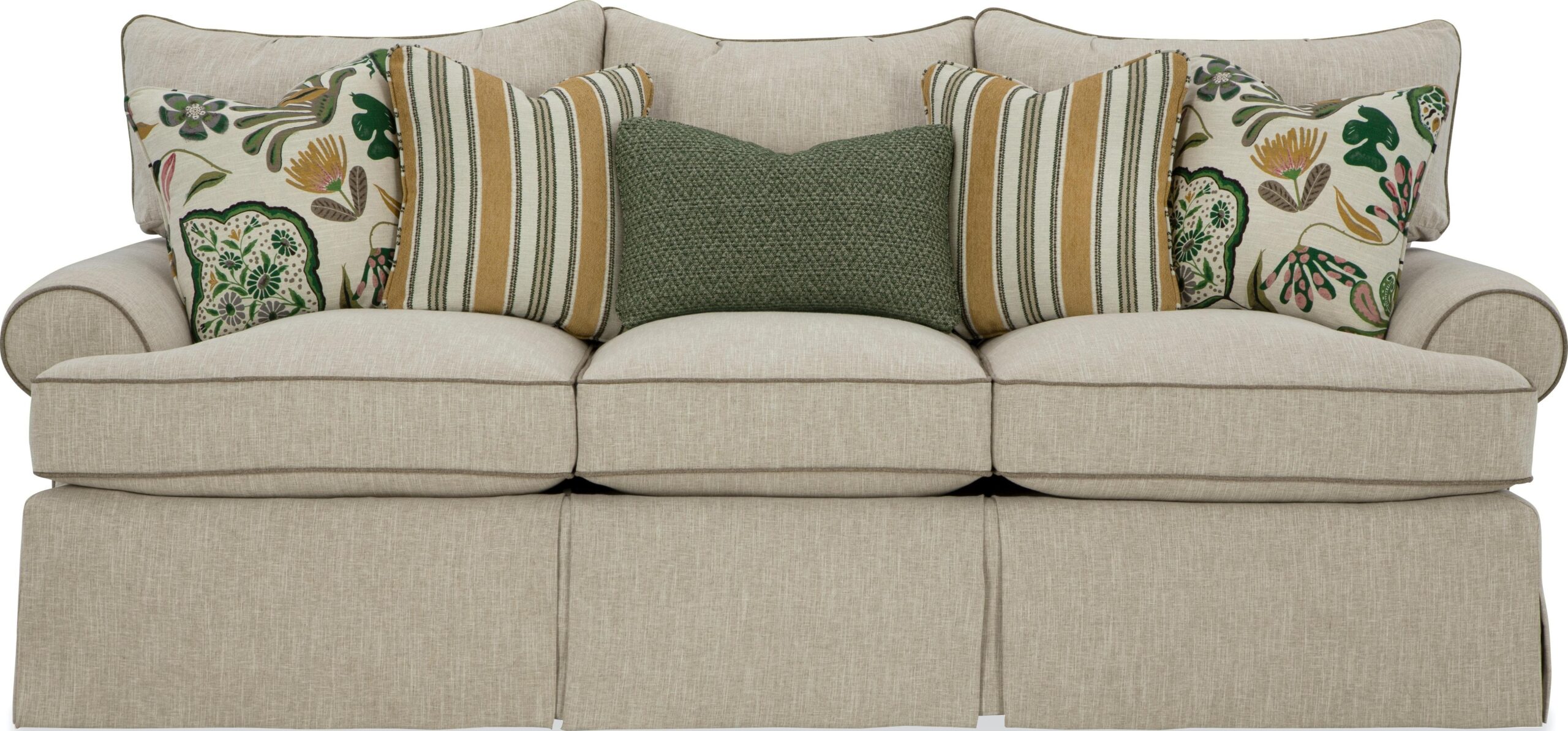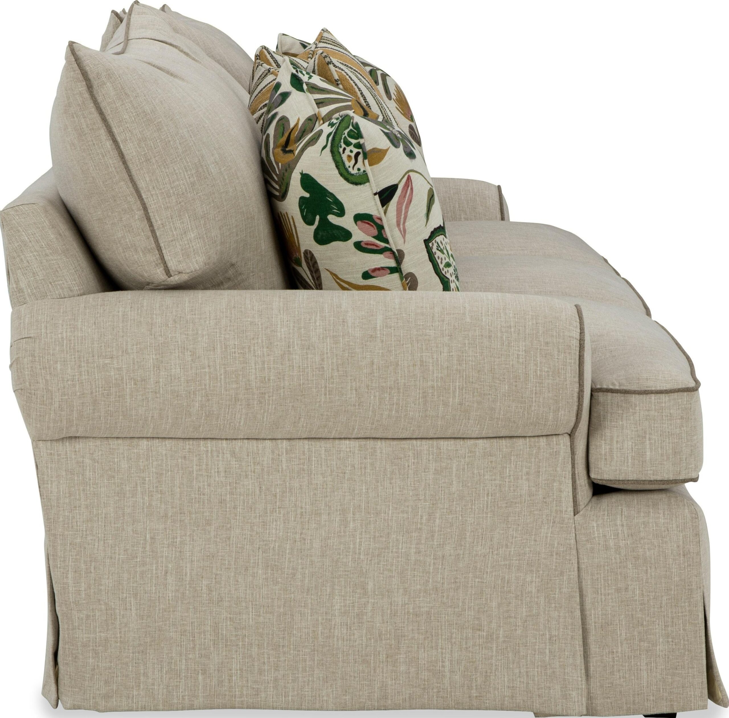 It’s easy to make room for everyone on this 100” sofa from the Paula Deen Home collection! This sofa is our best seller, and you can see why. It’s built for comfort, with 3 plush loose pillow backs, 5 accent pillows, and Paula’s exclusive Down Blend seat cushions. This style features sock arms, a high waterfall skirt and all the comforts of home! Also available are the matching loveseat, chair 1/2, and ottoman.